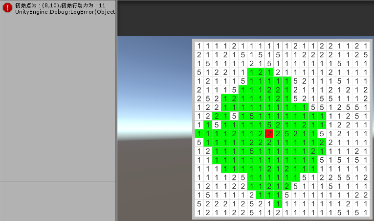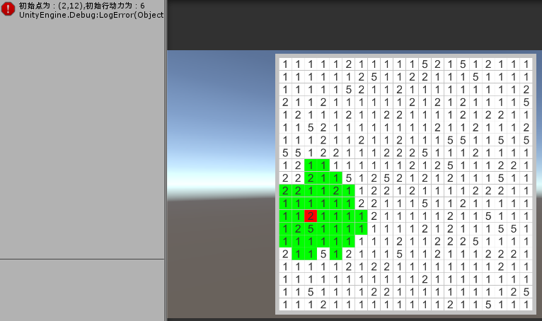 //向外遍历void GoNextStep(){tmp.Clear();foreach (var item in l){int xx = 0;int yy = 0;Debug.Log("-------------------");xx = item.x - 1;yy = item.y;CheckNode(xx, yy, item.rest);xx = item.x + 1;yy = item.y;CheckNode(xx, yy, item.rest);xx = item.x;yy = item.y + 1;CheckNode(xx, yy, item.rest);xx = item.x;yy = item.y - 1;CheckNode(xx, yy, item.rest);}l.Clear();if (tmp.Count > 0){Debug.LogError("tmp.Count " + tmp.Count);l.AddRange(tmp);GoNextStep();}}//检测四周的方块能否继续拓展,同时比较剩余行动力,如果剩余行动力更高,则加入下轮遍历的容器中private void CheckNode(int xx, int yy, int rest){Debug.Log("check x : " + xx + ", y : " + yy);if (Nodes.Count > yy && yy >= 0){if (Nodes[yy].Count > xx && xx >= 0){var n = Nodes[yy][xx];int newRest = rest - n.cost;if (newRest > n.rest){n.rest = newRest;if (n.rest > 0){n.SetColor(Color.green);tmp.Add(n);}else{n.SetColor(Color.red);}}}}}
