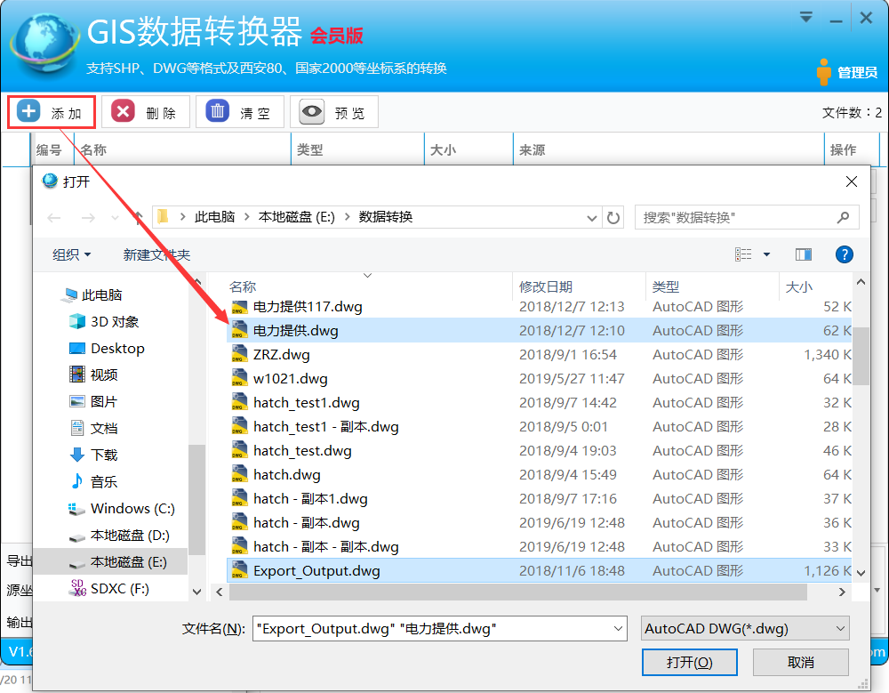 点击”添加“按钮,选择一个或多个AutoCAD(Dwg、Dxf)文件,软件支持批量转换。