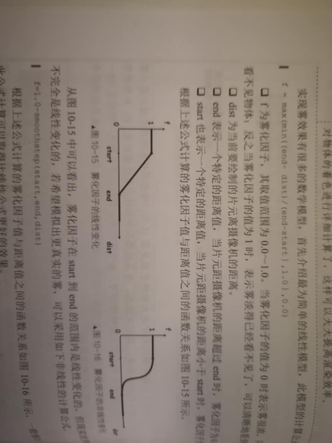 smooth out float vFogFactor;float computeFogFactor(){float tmpFactor;float fogDistance = length(uCamera-(uMMatrix*vec4(aPosition,1)).xyz);//顶点到摄像机的距离const float end = 5;//雾结束位置const float start = 30;//雾开始位置