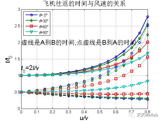 %飞机往返的时间clear %清除变量u=0:0.05:0.8; %空气速率与飞机速率之比的向量theta=0:30:90; %角度向量th=theta*pi/180; %化为弧度[U,TH]=meshgrid(u,th); %速率和角度矩阵T1=1/2./(sqrt(1-(U.*sin(TH)).^2)+U.*cos(TH));T2=1/2./(sqrt(1-(U.*sin(TH)).^2)-U.*cos(TH));T=sqrt(1-(U.*sin(TH)).^2)./(1-U.^2); %时间矩阵figure %创建图形窗口%plot(u,T,'LineWidth',2) %画往返时间曲线族plot(u,T(1,:),'o-',u,T(2,:),'d-',u,T(3,:),'s-',u,T(4,:),'v-','LineWidth',2)%画往返时间曲线族hold on %保持图像% plot(u,T1,'--','LineWidth',2) %画A到B的时间曲线族% plot(u,T2,':','LineWidth',2) %画B到A的时间曲线族plot(u,T1(1,:),'o--',u,T1(2,:),'d--',u,T1(3,:),'s--',u,T1(4,:),'v--','LineWidth',2)%画A到B的时间曲线族plot(u,T2(1,:),'o:',u,T2(2,:),'d:',u,T2(3,:),'s:',u,T2(4,:),'v:','LineWidth',2)%画B到A的时间曲线族grid on %加网格fs=16; %字体大小title('飞机往返的时间与风速的关系','FontSize',fs)%标题xlabel('\itu/v','FontSize',fs) %标记横坐标ylabel('\itt/t\rm_0','FontSize',fs) %标记纵坐标n=length(theta); %角度个数legend([repmat('\it\theta\rm=',n,1),num2str(theta'),repmat('\circ',n,1)],2)%图例text(0,1.2,'\itt\rm_0=2\itl/v','FontSize',fs)%标记时间单位text(0,2,'虚线是A到B的时间,点虚线是B到A的时间','FontSize',fs)%说明单向时间