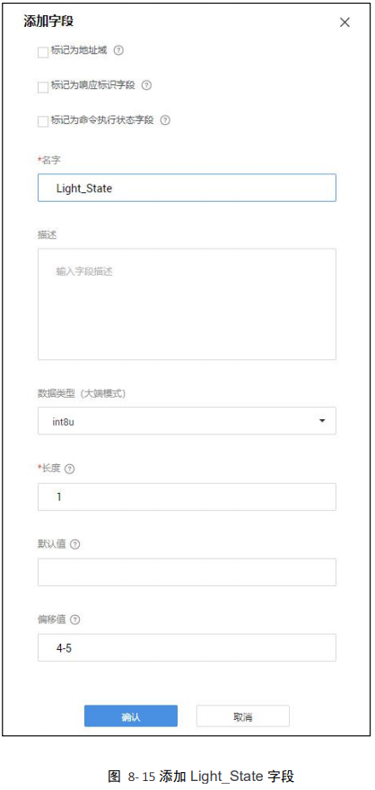 f) 在“新增消息”界面,单击“添加响应字段”,在“添加字段”界面,勾选“标记命令执行状态字段”,然后单击“确认”,添加命令执行状态字段 errcode,如图 8- 22 所示。