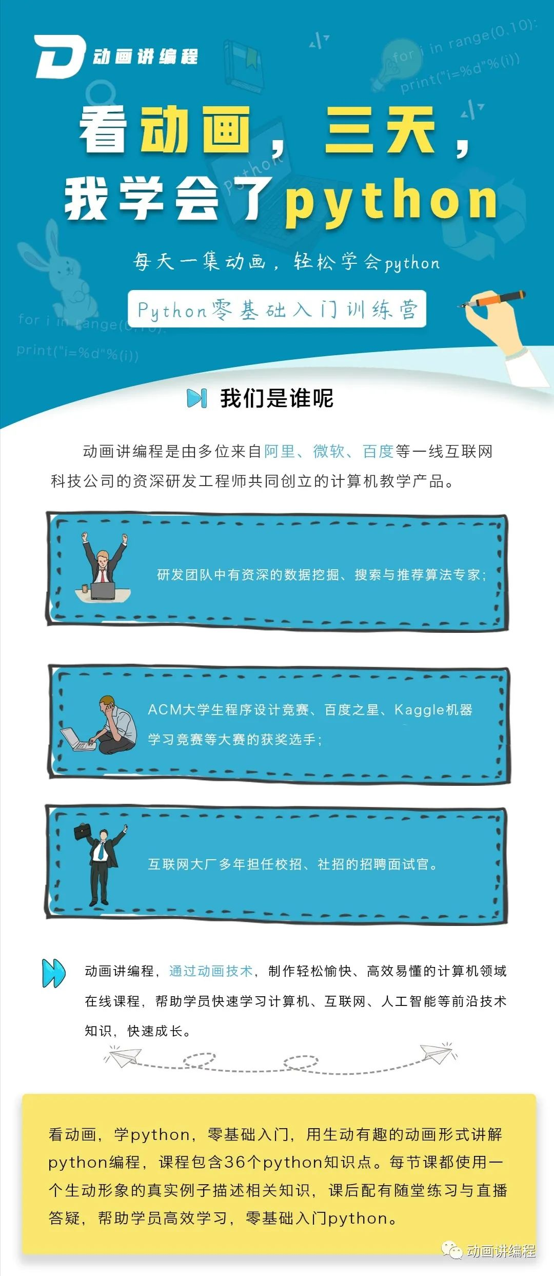 好的,那么我现在来介绍一套python课,在学习过程中,你看着动画,就能轻轻松松学明白python编程,培养出算法设计与工程开发能力,最终进入互联网、人工智能这个领域。就是《看动画,学python,零基础入门》训练营