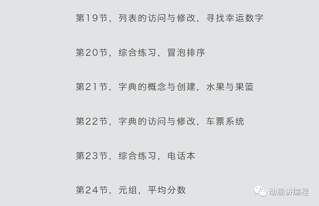 它一共包含36小节,每个小节都是一个形象生动的编程实例,课后配有巩固练习,覆盖python的基础知识、基础运算、条件分支、循环结构、列表、字典、元组、集合、字符串、函数、文件与目录等全部核心知识点,并且通过有效的综合案例,让学员入门算法设计与工程开发。