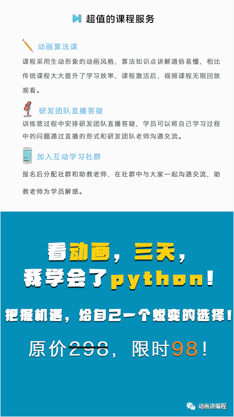 9.8元领取《看动画,学python,零基础入门》体验课吧!