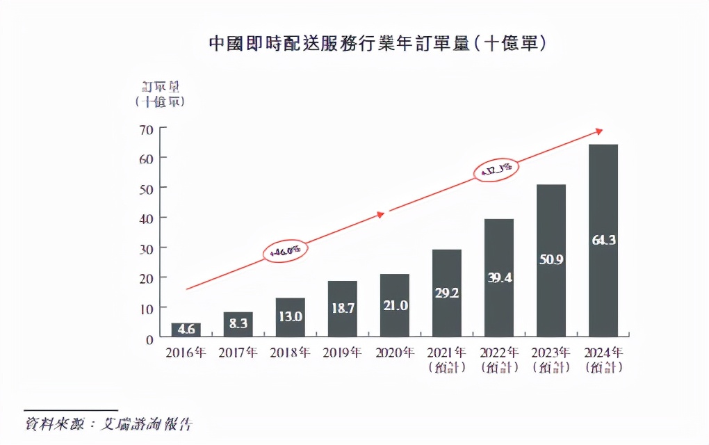 实时配送服务行业的年订单量从2016年的46亿单增至2020年的210亿单,复合年增长率为46.0%。考虑到新服务场景的不断扩展及新业态模式与消费模式的创新,实时配送服务行业具有明显的增长潜力。预计2024年中国实时配送服务行业的年订单量将进一步增至643亿单,2020年至2024年复合年增长率为32.3%。