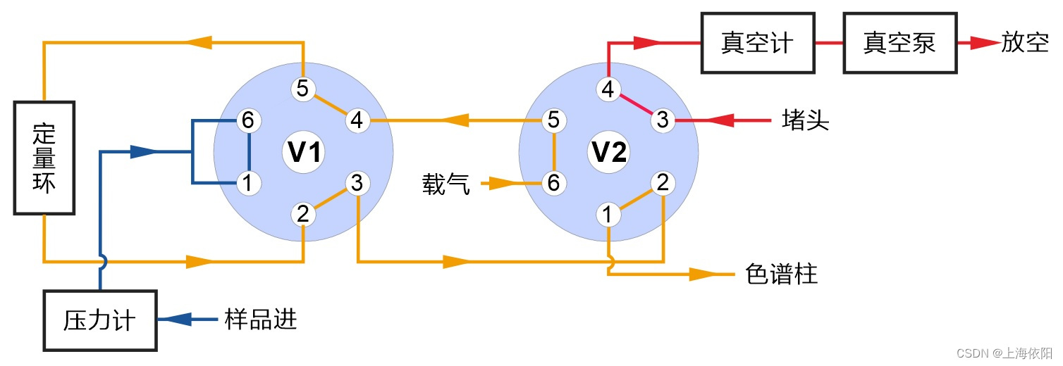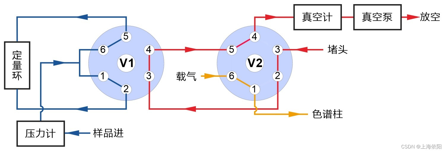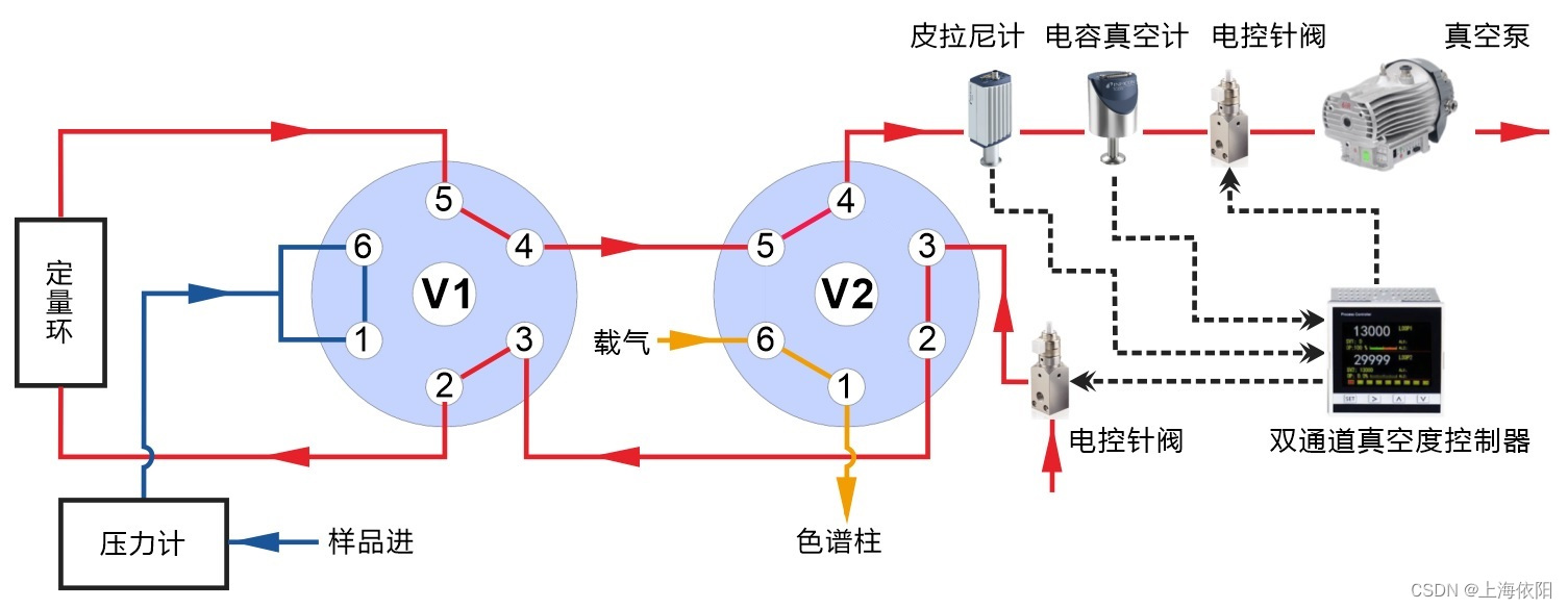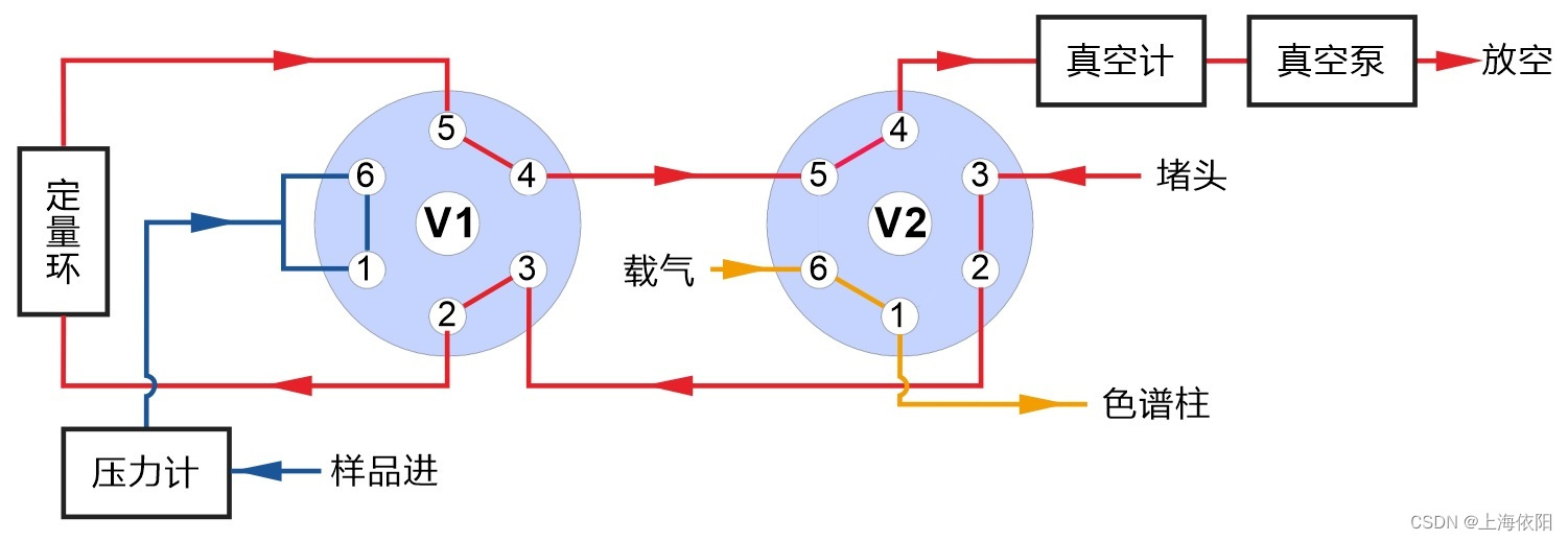 (1)定量环真空抽取和控制:两个六通阀全都处于关闭状态,整个气路处于图1所示结构,此时定量环处于真空抽取状态,真空回路如图中红线所示,控制定量环内的真空度达到设定值并稳定。样品进气和载气则处于图中蓝线和黄线所示的各自独立气路状态。