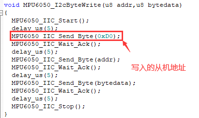 我们上面在介绍IO口的时候有提到根据AD0接口的状态,我们可以知道IIC通信的从机地址要么是0x68要么是0x69;然后我们根据模块的原理图得知, AD0是接地的,所以地址应该是0x68。但是我们在看代码的同时我们会发现,代码在写IIC通讯的时候,地址写的是0xD0,这是为什么呢?