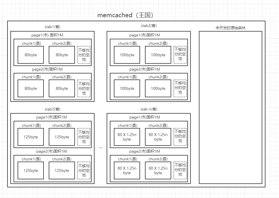 他会根据人口的数量进行划分成多个slab省。每个slab省里面又有page市、page市的默认领土面积是1M、在page市里面有分了许多的chunk县。每个chunk县的区域才是人口居住的地方。默认情况只能有80人(80byte)入住。最有趣的是memcached王国分配土地的人有很强的强迫症、为什么这么说呢。每个slab省里面的page市有1M的面积,但是划分出来的县级默认为80byte,这样就会有一个问题,如果page市里面最后的土地不够划分一个chunk省了会怎么办?这个王国是最任性的 我就这样空着什么也不做。