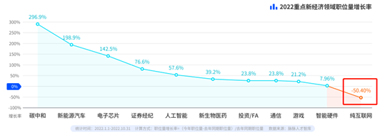 脉脉数据研究院发布的《抢滩数字时代·人才迁徙报告2023》, 报告显示,招聘职位缩减,2022年企业招聘总职位量同比减少21.67%。尤其是纯互联网职位量同比减少50.4%。