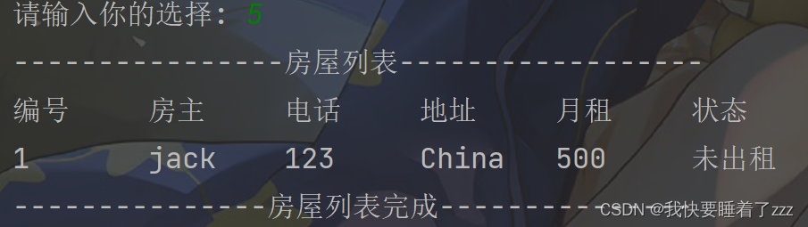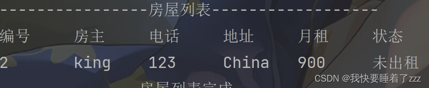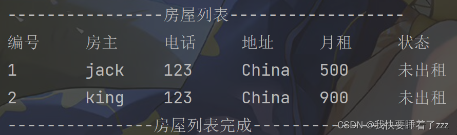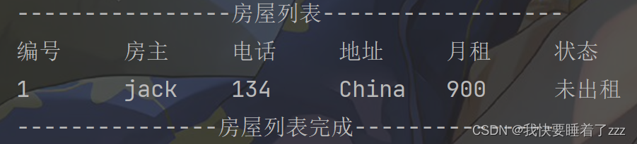 public void listHouse() {System.out.println("----------------房屋列表------------------");System.out.println("编号\t\t房主\t\t电话\t\t地址\t\t月租\t\t状态");for (int i = 0; i < houses.length; i++) {if (houses[i] != null)System.out.println(houses[i]);}System.out.println("---------------房屋列表完成---------------");}