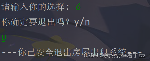 public void exit() {while (true) {System.out.println("你确定要退出吗?y/n");String think = scanner.next();if (think.equals("y")) {System.out.println("---你已安全退出房屋出租系统---");bool = false;break;} else if (think.equals("n")) {break;}}}