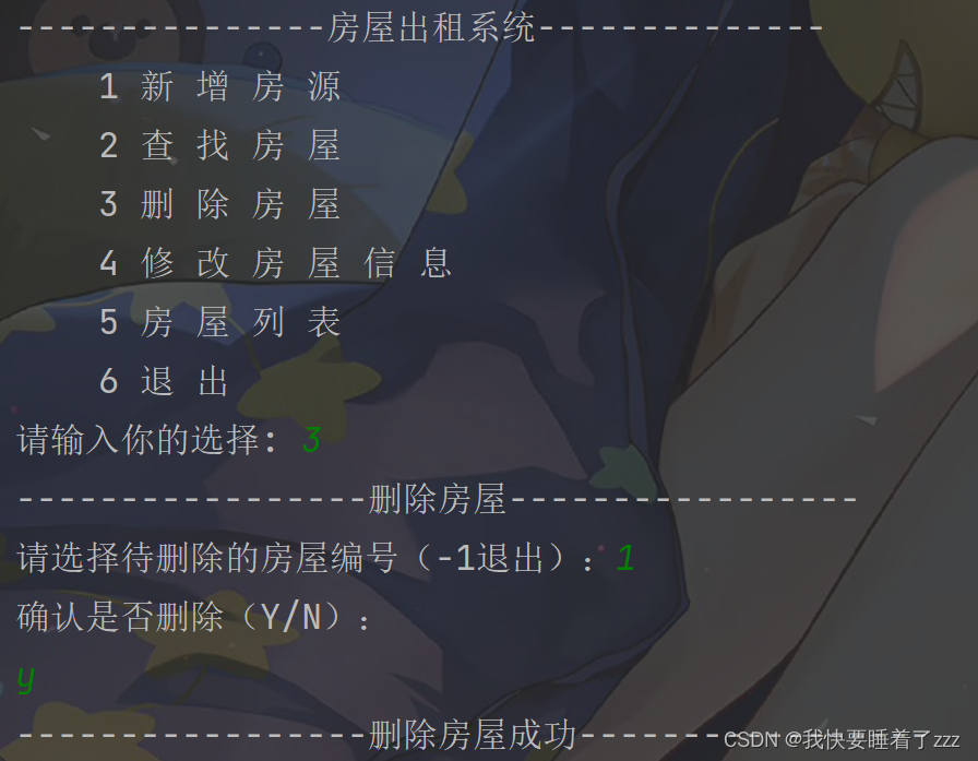 public void delHouse() {System.out.println("-----------------删除房屋-----------------");System.out.print("请选择待删除的房屋编号(-1退出):");int choice = scanner.nextInt();if (choice == -1) {System.out.println("-----------------退出删除房屋-----------------");return;}boolean flag;do {flag = false;System.out.println("确认是否删除(Y/N):");String conform = scanner.next();if (conform.equals("Y") || conform.equals("y")) {if (houseService.del(choice)) {System.out.println("-----------------删除房屋成功-----------------");} else {System.out.println("---------------没有该房屋,删除失败-------------");}} else if (conform.equals("N") || conform.equals("n")) {System.out.println("-----------------退出删除房屋-----------------");} else {System.out.println("您的输入有误请重新输入(Y/N)");flag = true;}} while (flag);}