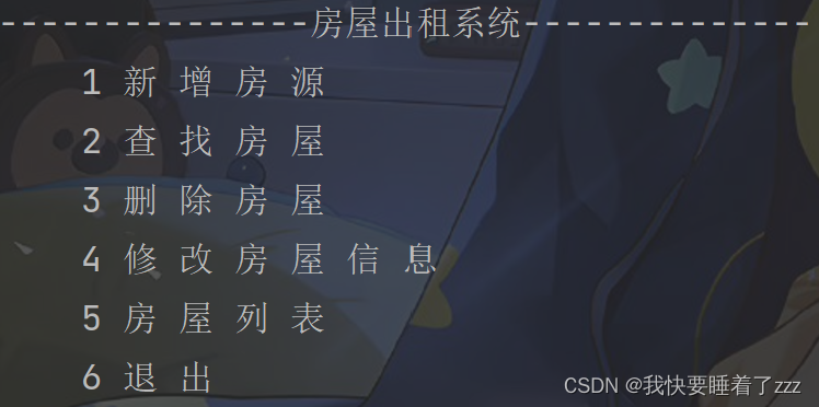 public void mainMenu() {do {System.out.println("---------------房屋出租系统--------------");System.out.println("\t1 新 增 房 源");System.out.println("\t2 查 找 房 屋");System.out.println("\t3 删 除 房 屋");System.out.println("\t4 修 改 房 屋 信 息");System.out.println("\t5 房 屋 列 表");System.out.println("\t6 退 出");System.out.print("请输入你的选择: ");key = scanner.next();switch (key) {case "1"://新增房源addHouse();break;case "2"://查找房源findHouse();break;case "3"://删除房源delHouse();break;case "4":changeHouse();//修改房屋信息break;case "5":listHouse();//房屋列表break;case "6"://退出exit();break;default:System.out.println("你的输入有误,请重新输入!");}} while (bool);}
