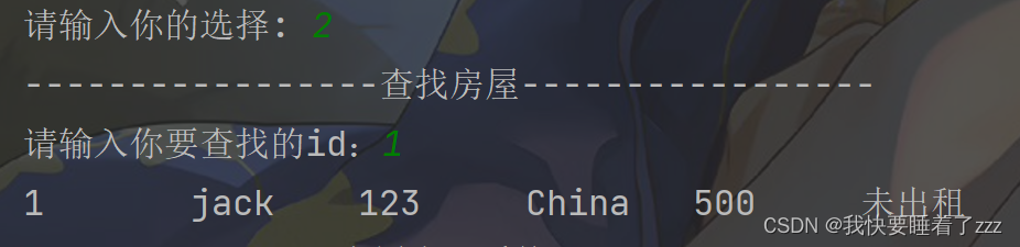 public void findHouse() {System.out.println("-----------------查找房屋-----------------");System.out.print("请输入你要查找的id:");int id = scanner.nextInt();int i = houseService.find(id);if (i != -1) {System.out.println(houses[i]);} else {System.out.println("不存在这个id的房屋!");}}