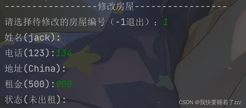 public void changeHouse() {System.out.println("-----------------修改房屋-----------------");System.out.print("请选择待修改的房屋编号(-1退出):");int choice = scanner.nextInt();scanner.nextLine();if (choice == -1) {System.out.println("-----------------退出修改房屋-----------------");return;}int index = houseService.find(choice);if (index == -1) {System.out.println("不存在该编号的房屋");} else {//如果输入回车,则对原有信息不做修改。System.out.print("姓名(" + houses[index].getName() + "):");String name = scanner.nextLine();if (name.length() != 0) {houses[index].setName(name);}System.out.print("电话(" + houses[index].getTel() + "):");String tel = scanner.nextLine();if (tel.length() != 0) {houses[index].setTel(tel);}System.out.print("地址(" + houses[index].getAddress() + "):");String address = scanner.nextLine();if (address.length() != 0) {houses[index].setAddress(address);}System.out.print("租金(" + houses[index].getRent() + "):");String rent = scanner.nextLine();// int rent = scanner.nextInt();if (rent.length() != 0) {houses[index].setRent(Integer.parseInt(rent));}System.out.print("状态(" + houses[index].getState() + "):");String state = scanner.nextLine();if (state.length() != 0) {houses[index].setState(state);}}}