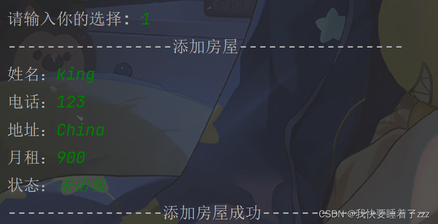 public void addHouse() {System.out.println("-----------------添加房屋-----------------");System.out.print("姓名:");String name = scanner.next();System.out.print("电话:");String tel = scanner.next();System.out.print("地址:");String address = scanner.next();System.out.print("月租:");int rent = scanner.nextInt();System.out.print("状态:");String state = scanner.next();House house = new House(0, name, tel, address, rent, state);if (houseService.add(house)) {System.out.println("----------------添加房屋成功-----------------");} else {System.out.println("房屋已满!");}}