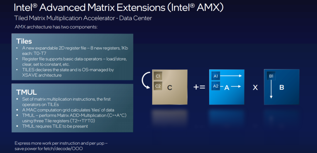 就在大家认为英特尔在 CPU 加速 AI 的技术创新和投入会止步于此的时候,第四代至强可扩展芯片,又带来了矩阵化的算力支持 ——AMX。