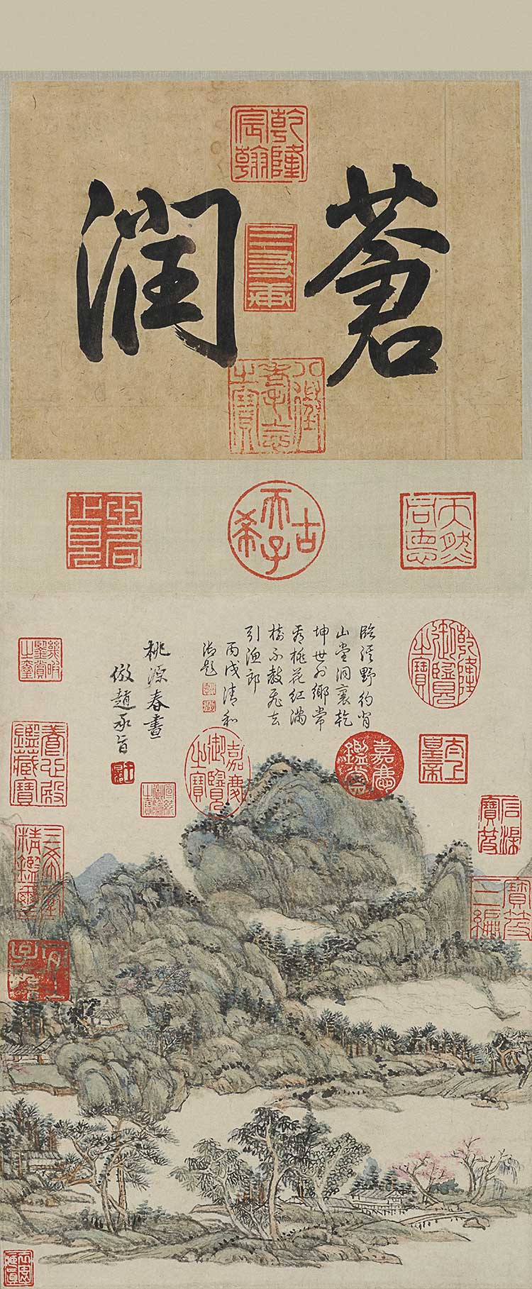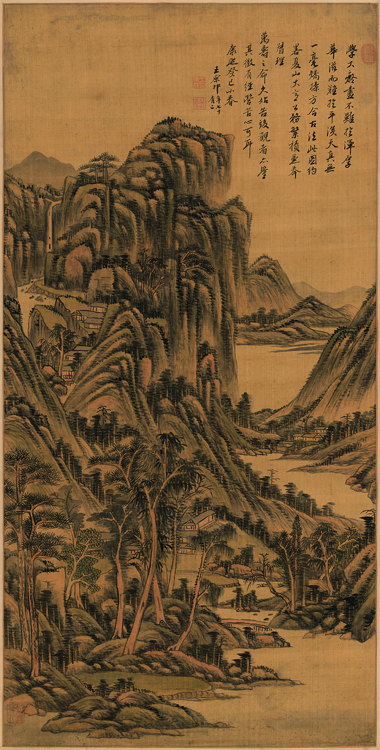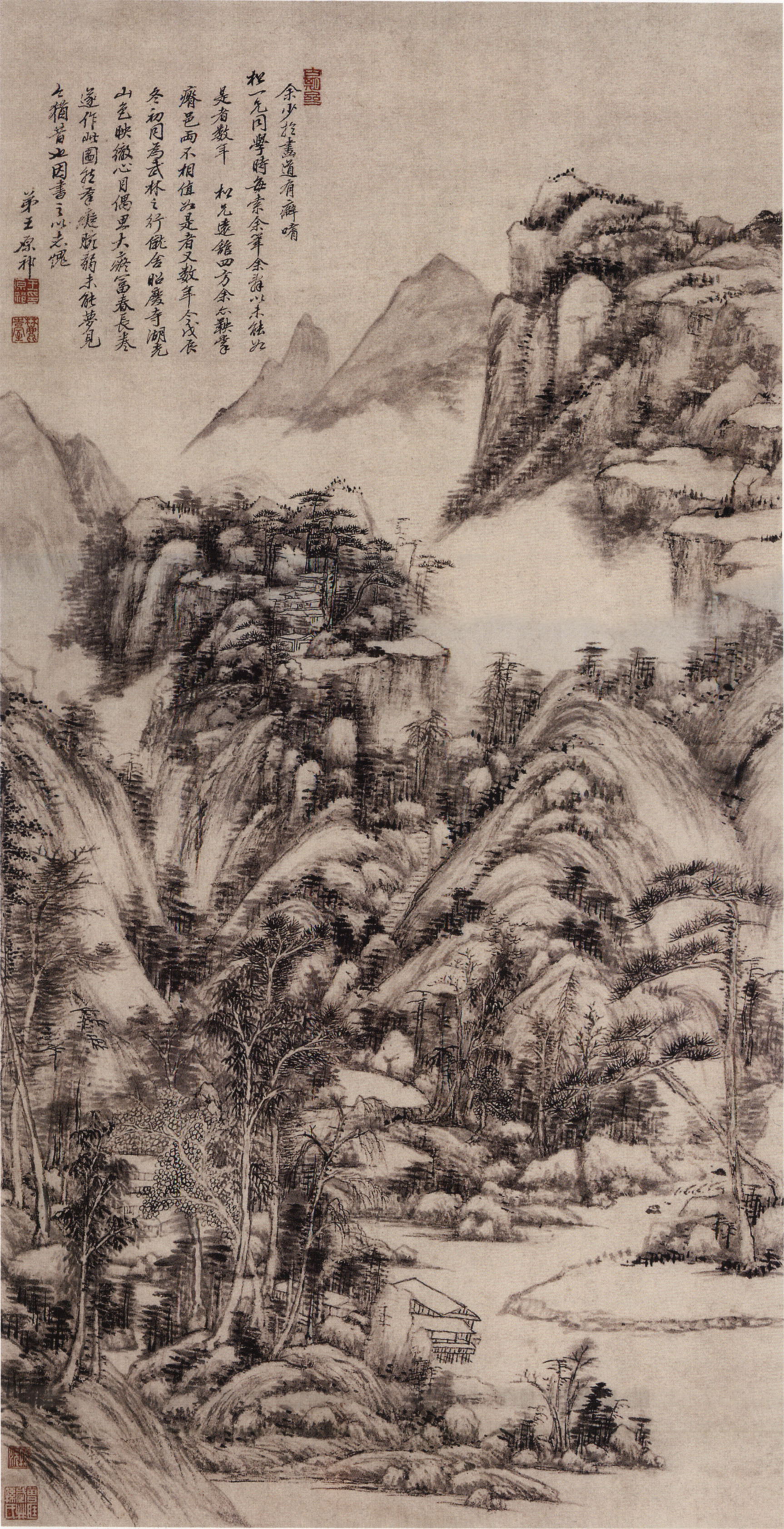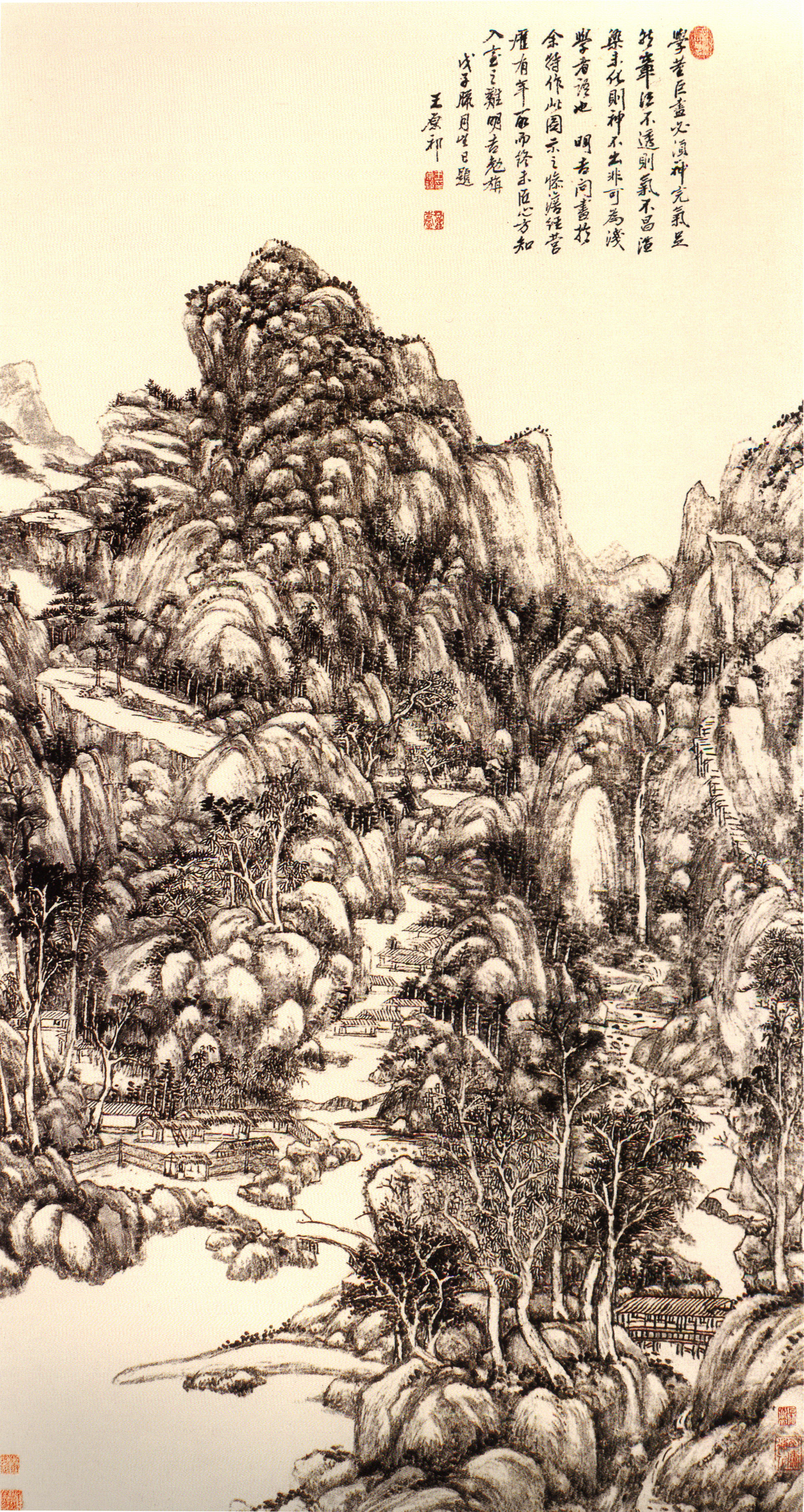 王原祁聪明有才华,为康熙时进士,因专心画学,被召供奉内廷,任书画谱馆总裁,负责编纂《佩文斋书画谱》,并鉴定古今书画,后又升至户侍郎,故又称他为“王司农”。绘画方面他得祖父和王鉴的传授,也是走的临古路子,尤其喜欢临摹黄公望,笔墨生拙,韵味醇厚,在技巧方面,他喜欢用干笔积墨法,先用笔后用墨,连皴带染,由淡而浓,由疏而密,反复皴擦,画面显得融和厚金。