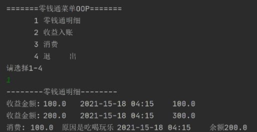 public static void main(String[] args) {boolean loop;loop = true;String detail = "--------零钱通明细--------";String note ;Scanner myScanner = new Scanner(System.in);String key = "";//零钱通明细:定义新的变量 收入 余额 日期double money = 0;double balance = 0;Date date = null;SimpleDateFormat sdf = new SimpleDateFormat("yyyy-mm-dd hh:mm");//因为要一直显示菜单,所以采用do——whiledo{System.out.println("\n"+"=======零钱通菜单=======");System.out.println(" 1 零钱通明细");System.out.println(" 2 收益入账");System.out.println(" 3 消费");System.out.println(" 4 退 出");System.out.println("请选择1-4");