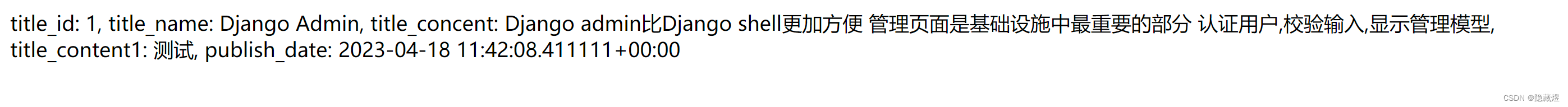 def title_concent(request):atitle = Title.objects.all()[0]title_id = atitle.title_idtitle_name = atitle.title_nametitle_count = atitle.title_countpublish_date = atitle.publish_datereturn HttpResponse("title_id: %s, title_name: %s,"" title_count: %s, publish_date: %s"% (title_id, title_name, title_count, publish_date))