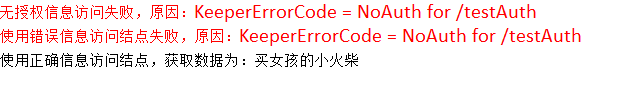 public class ZookeeperAuth2{//连接地址private static final String CONNECTION_ADDR = "192.168.1.101:2181,192.168.1.102:2181,192.168.1.103:2181"; //测试路径private static final String NODE_PATH = "/testAuth";//认证类型private static final String AUTH_TYPE = "digest";//正确的认证private static final String AUTH_VALUE = "20190112";//错误的认证private static final String AUTH_BAD_VALUE = "20180112";public static void main(String[] args) {try {//一、创建节点ZooKeeper zk=new ZooKeeper(CONNECTION_ADDR,5000,new Watcher() {public void process(WatchedEvent event) {}});zk.addAuthInfo(AUTH_TYPE,AUTH_VALUE.getBytes());zk.create(NODE_PATH,"买女孩的小火柴".getBytes(), Ids.CREATOR_ALL_ACL, CreateMode.PERSISTENT);} catch (Exception e) {System.err.println("节点创建失败,原因:" + e.getMessage());}try { //二、无授权信息访问ZooKeeper zk2=new ZooKeeper(CONNECTION_ADDR,5000,new Watcher() {public void process(WatchedEvent event) {}});System.out.println("无授权信息访问,获取数据为:" + new String(zk2.getData(NODE_PATH,false,null)));} catch (Exception e) {System.err.println("无授权信息访问失败,原因:" + e.getMessage());}try { //三、使用错误信息访问结点ZooKeeper zk3=new ZooKeeper(CONNECTION_ADDR,5000,new Watcher() {public void process(WatchedEvent event) {}});zk3.addAuthInfo(AUTH_TYPE,AUTH_BAD_VALUE.getBytes());System.out.println("使用错误信息访问结点,获取数据为:" + new String(zk3.getData(NODE_PATH,false,null)));} catch (Exception e) {System.err.println("使用错误信息访问结点失败,原因:" + e.getMessage());} try { //四、使用正确信息访问结点ZooKeeper zk4=new ZooKeeper(CONNECTION_ADDR,5000,new Watcher() {public void process(WatchedEvent event) {}});zk4.addAuthInfo(AUTH_TYPE,AUTH_VALUE.getBytes());System.out.println("使用正确信息访问结点,获取数据为:" + new String(zk4.getData(NODE_PATH,false,null)));} catch (Exception e) {System.err.println("使用正确信息访问结点失败,原因:" + e.getMessage());}}}