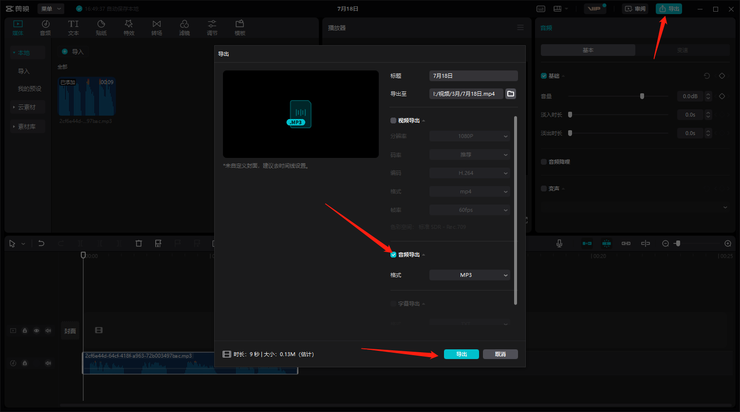 剪映是一款流行的视频编辑应用程序,但它也提供了音频转换功能,可以将WAV文件转换为MP3格式。你只需在剪映应用程序中选择要转换的WAV文件,并将其拖动到时间轴的音频轨道上。然后,选择导出选项,设置音频格式为MP3,并导出文件。转换完成后,你可以选择保存位置,并获取转换后的MP3文件。
