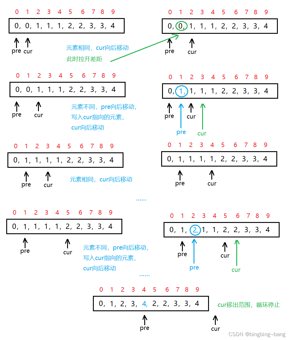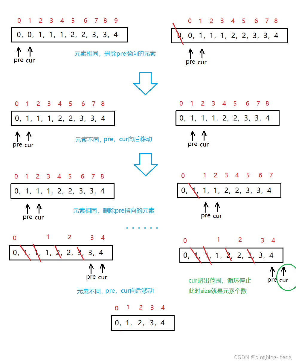 具体做法为使用两个下标进行控制元素,当遇到相同元素时,pre不动,cur向后移动,此时就会拉开一定的差距。当遇到的元素不同时,pre先向后移动,然后将cur指向的元素写入到pre指向的地方,然后cur再向后移动。当cur移出数组范围时,循环停止,此时pre指向的元素以及之前的元素均为不同的元素,返回长度即可。