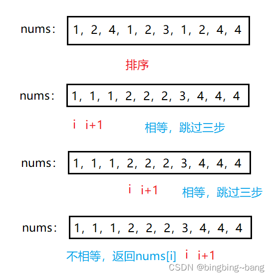 既然数组中只有一个元素出现一次,其他的都出现三次,那么我们先对其进行排序,排序完成后从头开始进行寻找,如果nums[i]==nums[i+1]则说明该元素不为出现一次的元素,那么i向后移动三步跳过该元素,如果前后元素不相等,则说明找到该元素,直接返回即可。