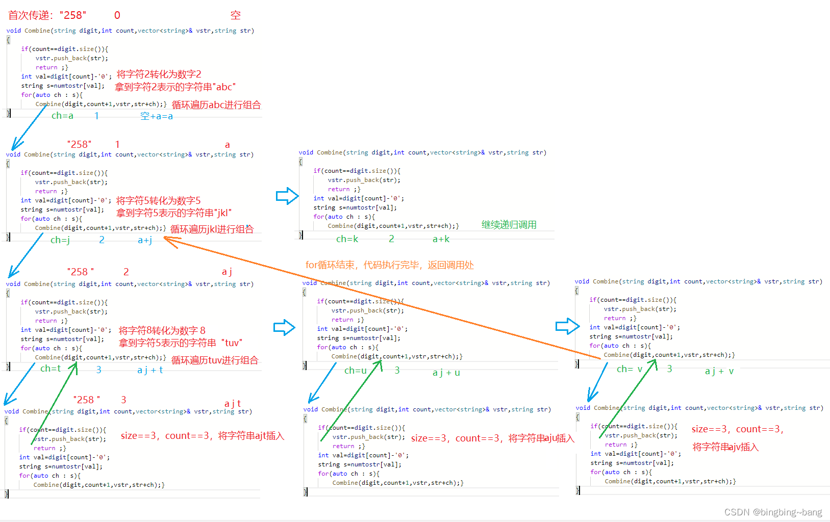 public:void Combine(string digit,int count,vector& vstr,string str){if(count==digit.size()){vstr.push_back(str);return ;}int val=digit[count]-'0';string s=numtostr[val];for(auto ch : s){Combine(digit,count+1,vstr,str+ch);}}vector letterCombinations(string digits) {vector vstr;if(digits.empty()){return vstr;}int count=0;string str;Combine(digits,count,vstr,str);return vstr;}