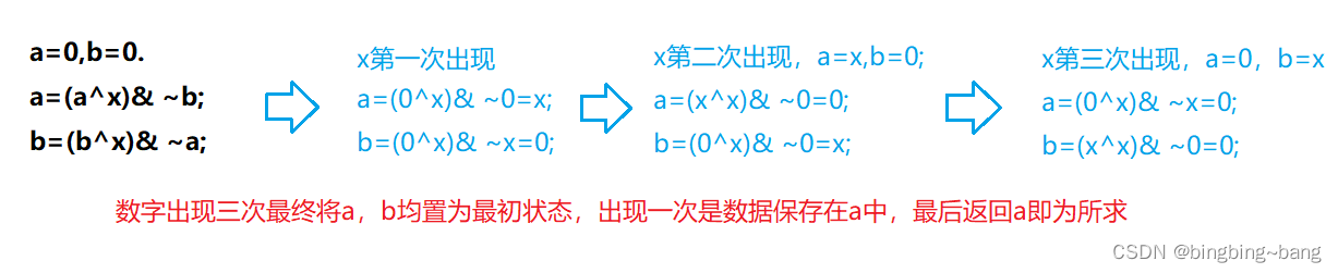 那么我们只需要运用上面的式子将一个数出现三次后将其变为0即可。因此我们使用两个数字进行辅助,初始值设置为 0。