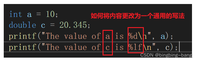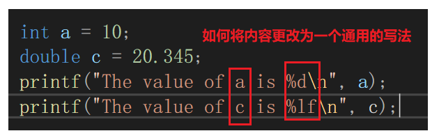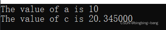 {int a = 10;double c = 20.345;PRINT(a,"%d");PRINT(c, "%lf");return 0;