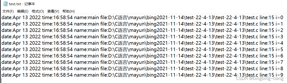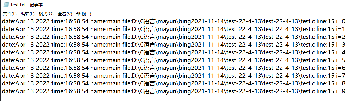 {FILE* pf = fopen("test.txt", "w");if (pf == NULL){perror("fopen");return 1;}int i = 0;for (; i < 10; i++){fprintf(pf, "date:%s time:%s name:%s file:%s line:%d i=%d\n",