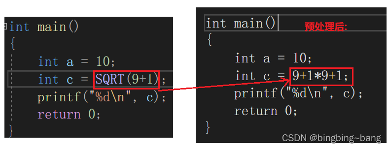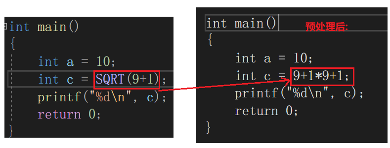 如上图所示,在预处理之后,代码变更为9+1*9+1,由于乘法运算优先于加法运算,这就导致先计算1*9,然后计算9+9+1,最终结果为19.