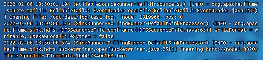 [root@node1 flumeconf]# flume-ng agent -n a1 -c ../conf/ -f ./taidir-file-hdfs.conf -Dflume.root.logger=INFO,console