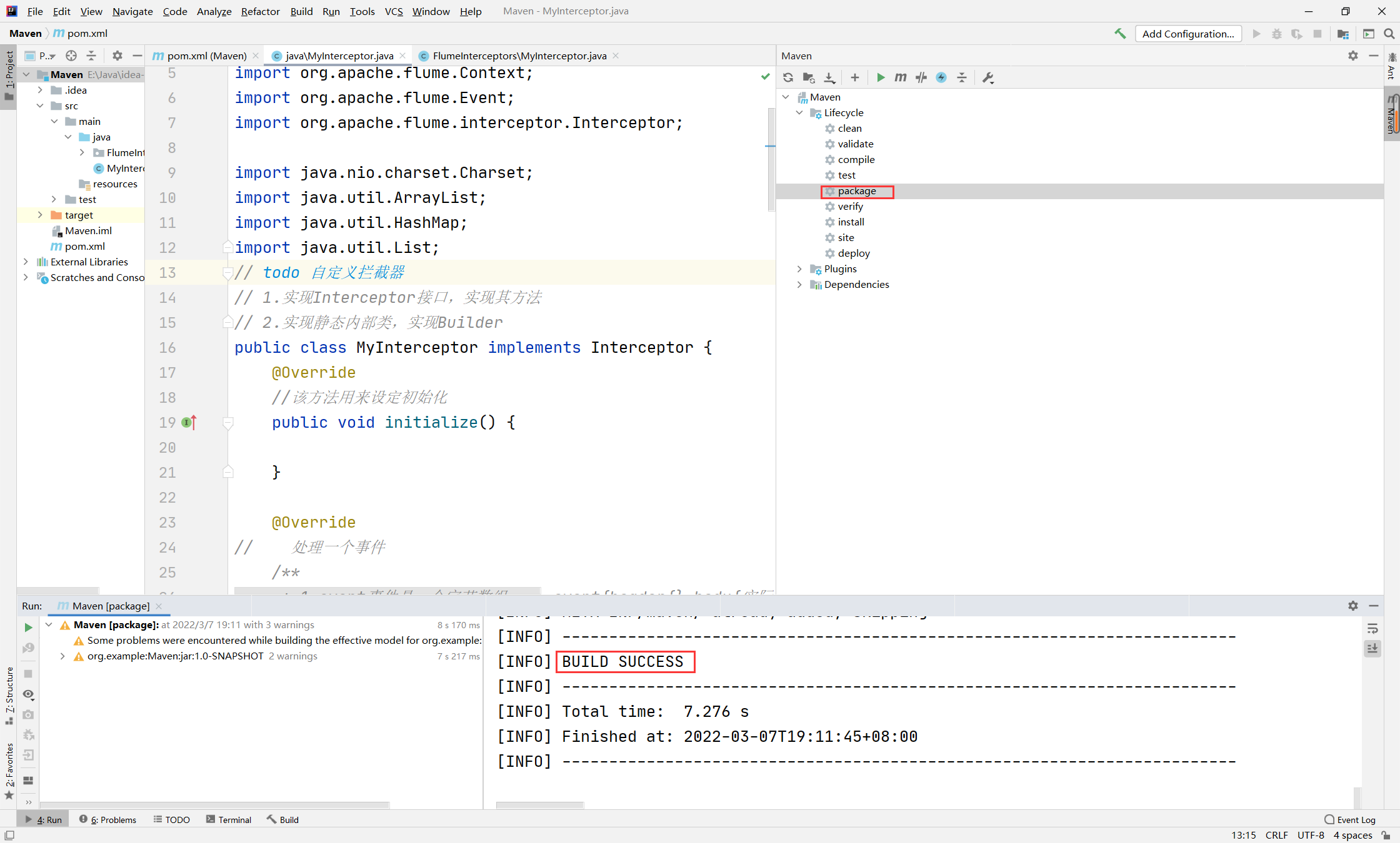 build():该方法主要用来返回创建的自定义类拦截器对象 configure():通过该对象可以获取flume配置自定义拦截器的参数