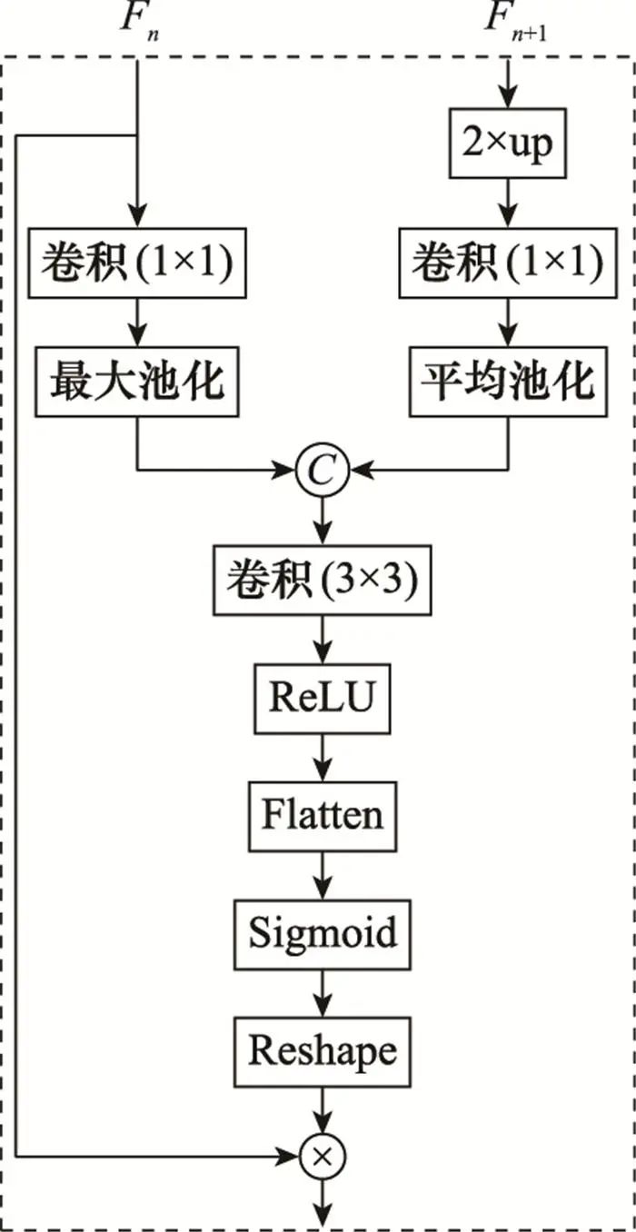 式中: σSigmoid、σReLU分别表示Sigmoid、ReLU激活函数函数; f1×1、f3×3分别表示1×1、3×3卷积; AvgPool(·)、MaxPool(·)、g2x-up(·)分别表示平均池化、最大池化和2倍上采样; ⊕表示concat特征融合方式。