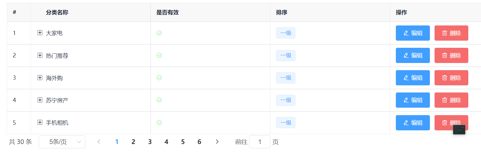 // table指定列的定义columns:[{// 列名label:'分类名称',// 渲染出来的数据prop:'cat_name'},//自定义新的一列{label:'是否有效',type:'template',template:'isok'},{label:'排序',prop:'cat_level',type:'template',template:'sort'},{label:'操作',type:'template',template:'setting'}],