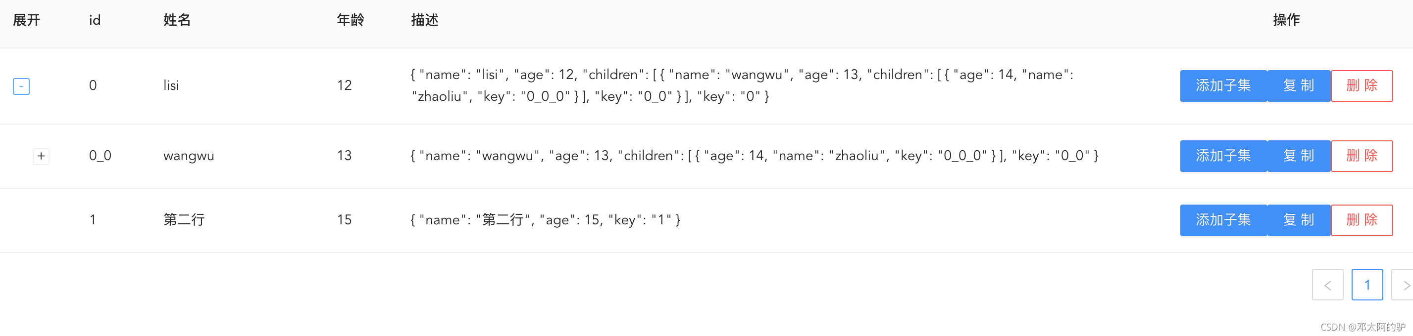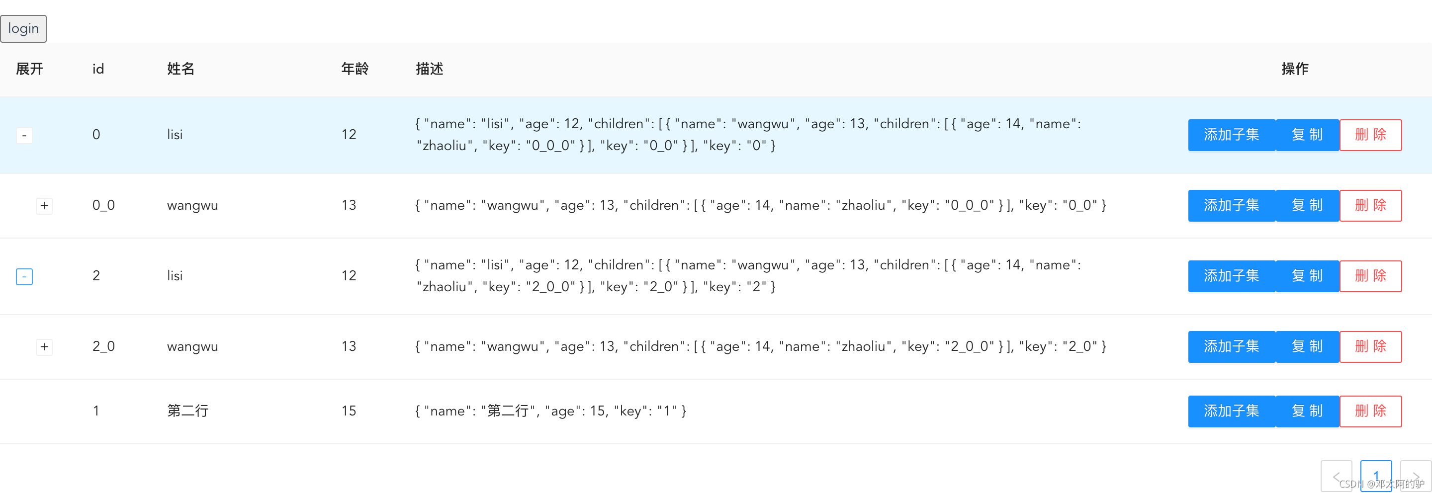 const dataSource = reactive({ list: [] })dataSource.list = [{name: "lisi",age: 12,children: [{name: "wangwu",age: 13,children: [{age: 14,name: "zhaoliu",},],},],},{name: '第二行',age: 15,children: null}];const columns = [{title: '展开',width: 75},{title: 'id',width: 75,dataIndex: 'key'},{title: '姓名',dataIndex: 'name',width: 175,},{title: '年龄',dataIndex: 'age',width: 75,slots: {customRender: 'age'}},{title: '描述',dataIndex: 'desc',slots: {customRender: 'desc'}},{title: '操作',dataIndex: 'action',width: 275,align: 'center',slots: {customRender: 'action'}},]