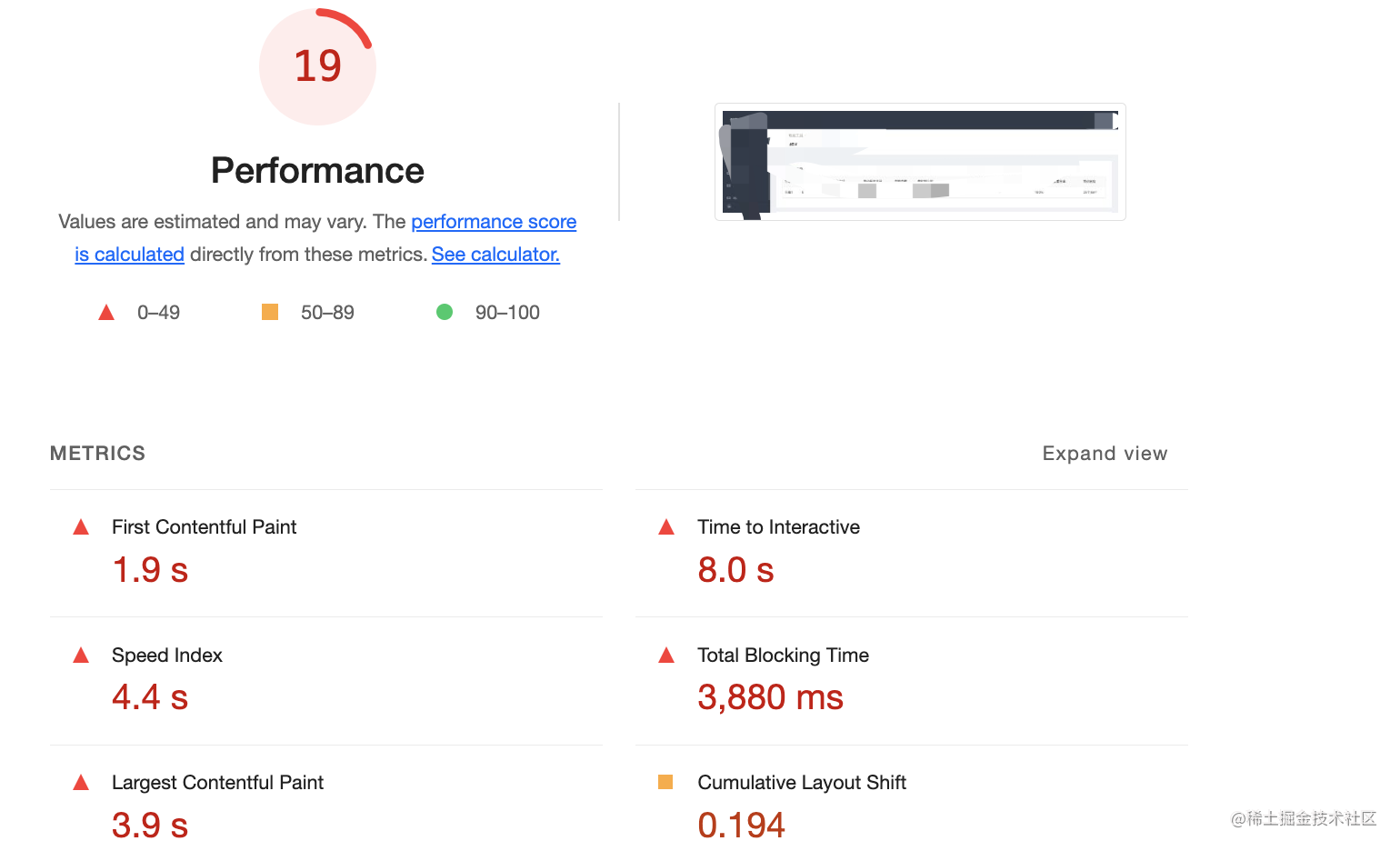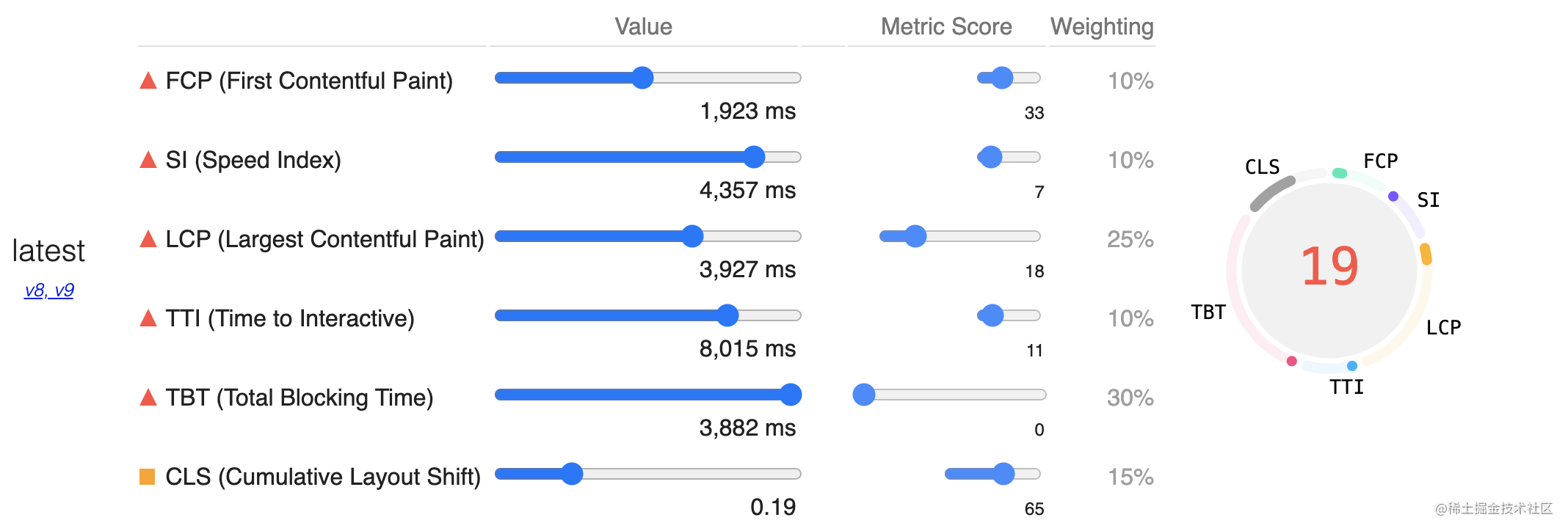 透过该工具,我们可以得到当前页面性能的一个大概得分,它是基于各个指标的分数按照一定的权重比例系列换算而来的,是一个综合性的评价结果,分数越低性能越差。当前页面性能的19分的计算如下图:
