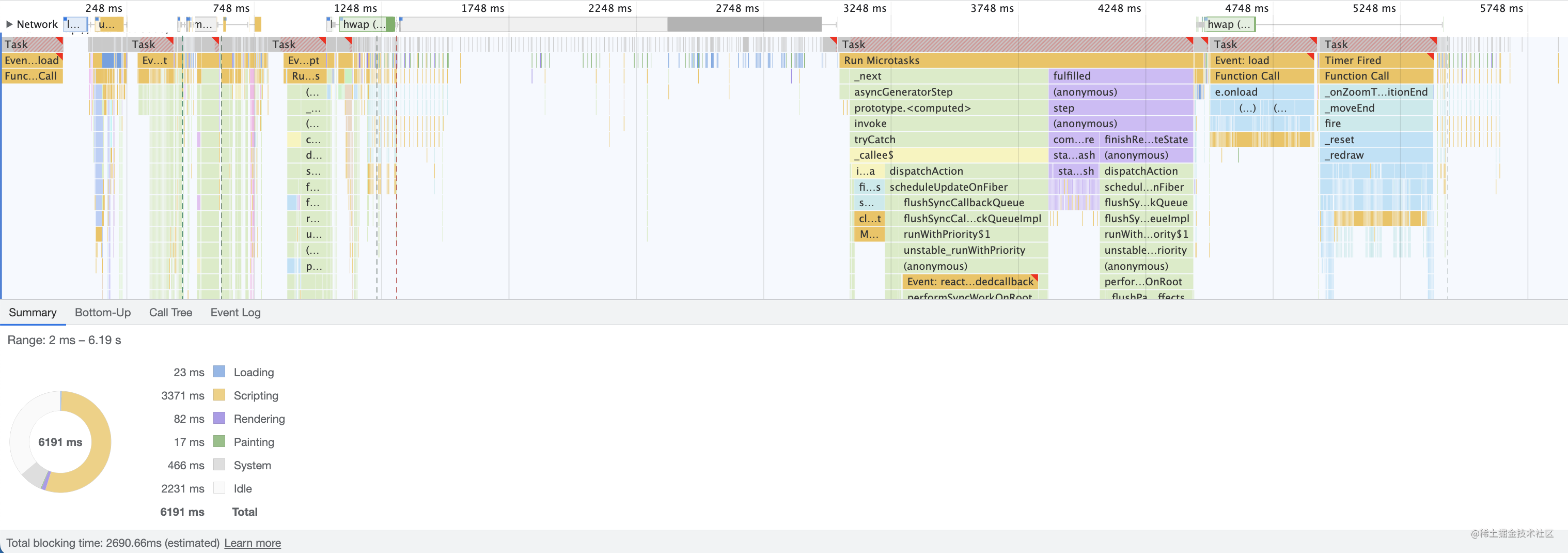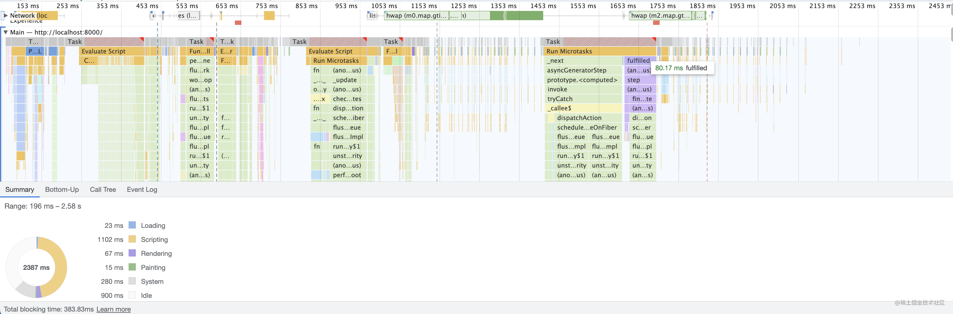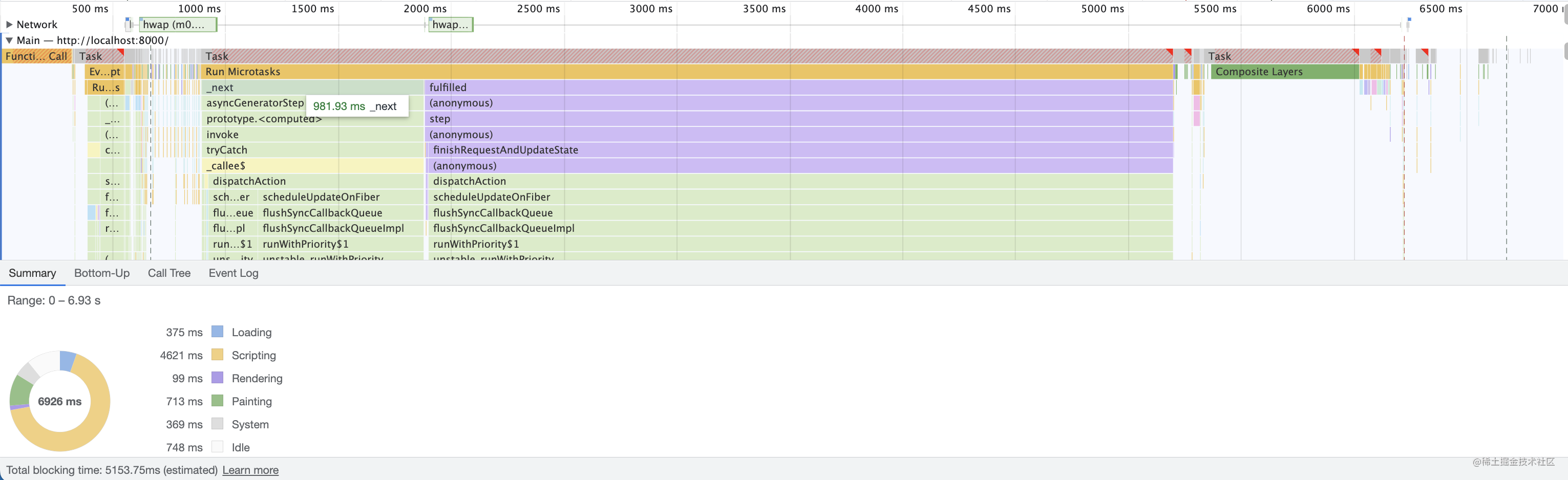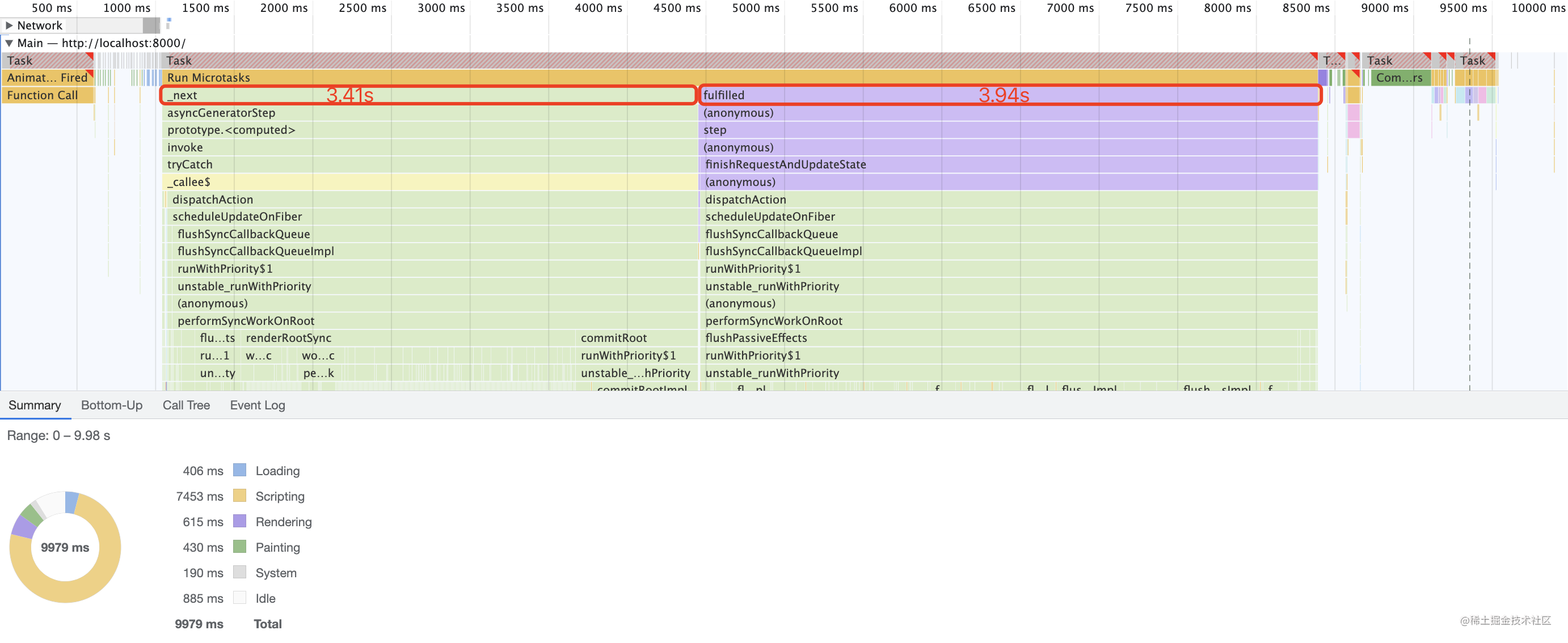 从中可以得知,数据渲染完毕页面耗时近10s,其中js执行耗时花费7.6s左右,从js执行的调用栈看出主要是Microtasks下的花费3.4s的_next和3.94s的fulfilled两部分: