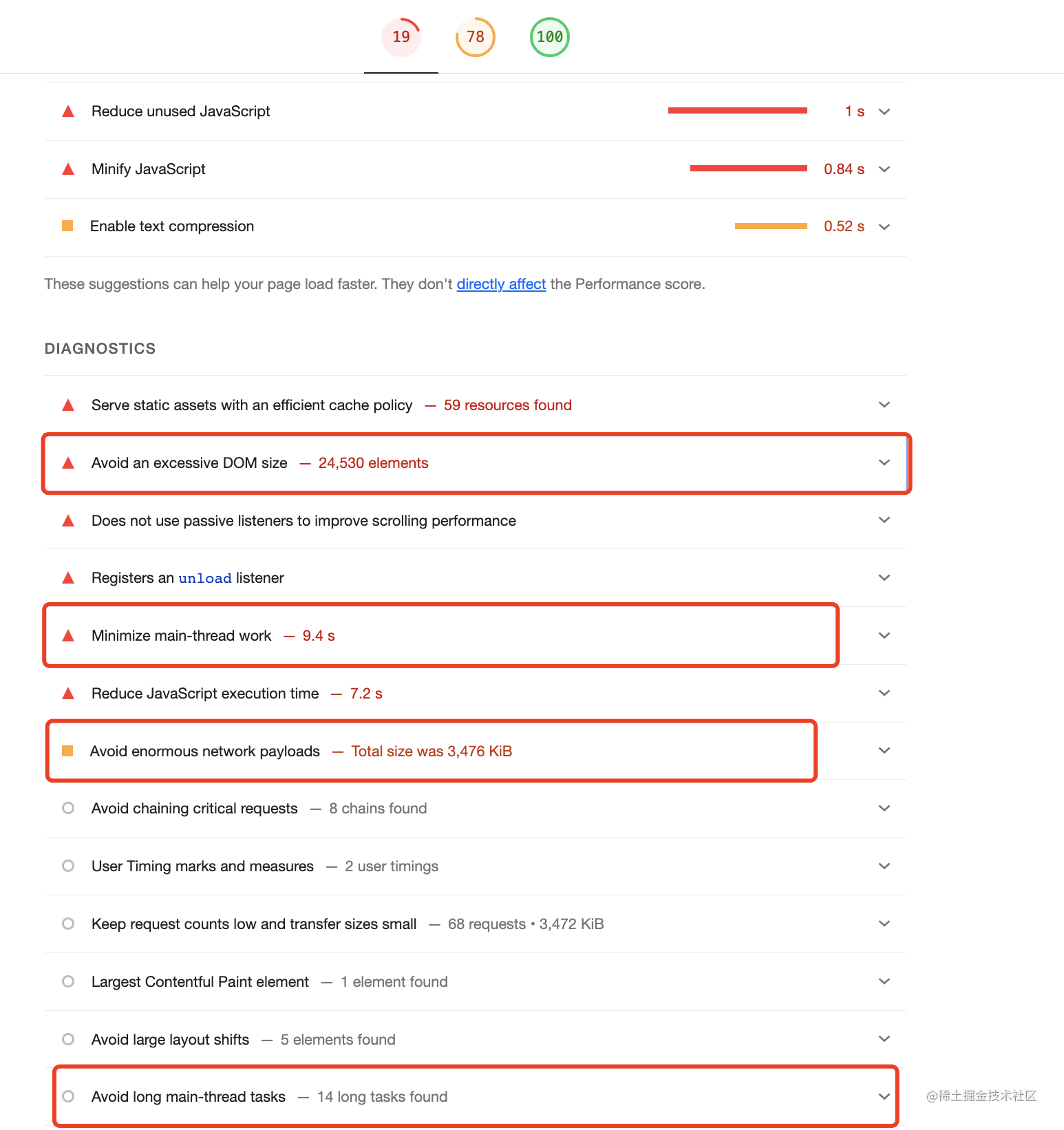 因为是在本地开发环境跑的lighthouse,所以有些优化项如压缩js等不用关注,我们主要看红框标记的几项,可以说这几项是导致性能差的主要原因,需要重点关注优化。