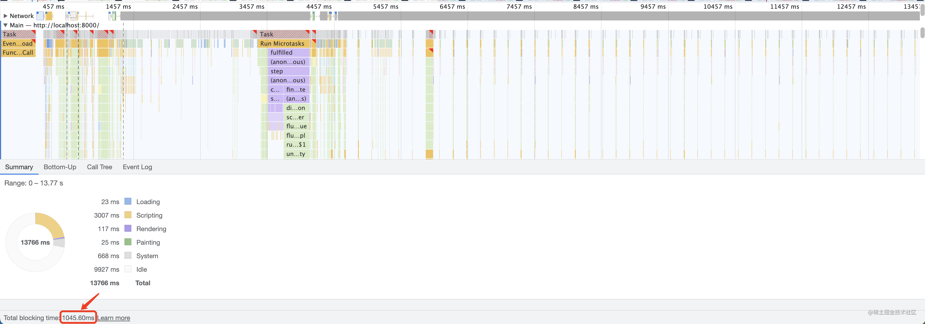针对主线程耗时长的问题,lighthouse会给出了浏览器渲染的整个流程中每一部分的耗时时长,但它不会详细告诉我们每一部分具体耗时在什么地方,这正是chrome devtool的Performance面板的强项。