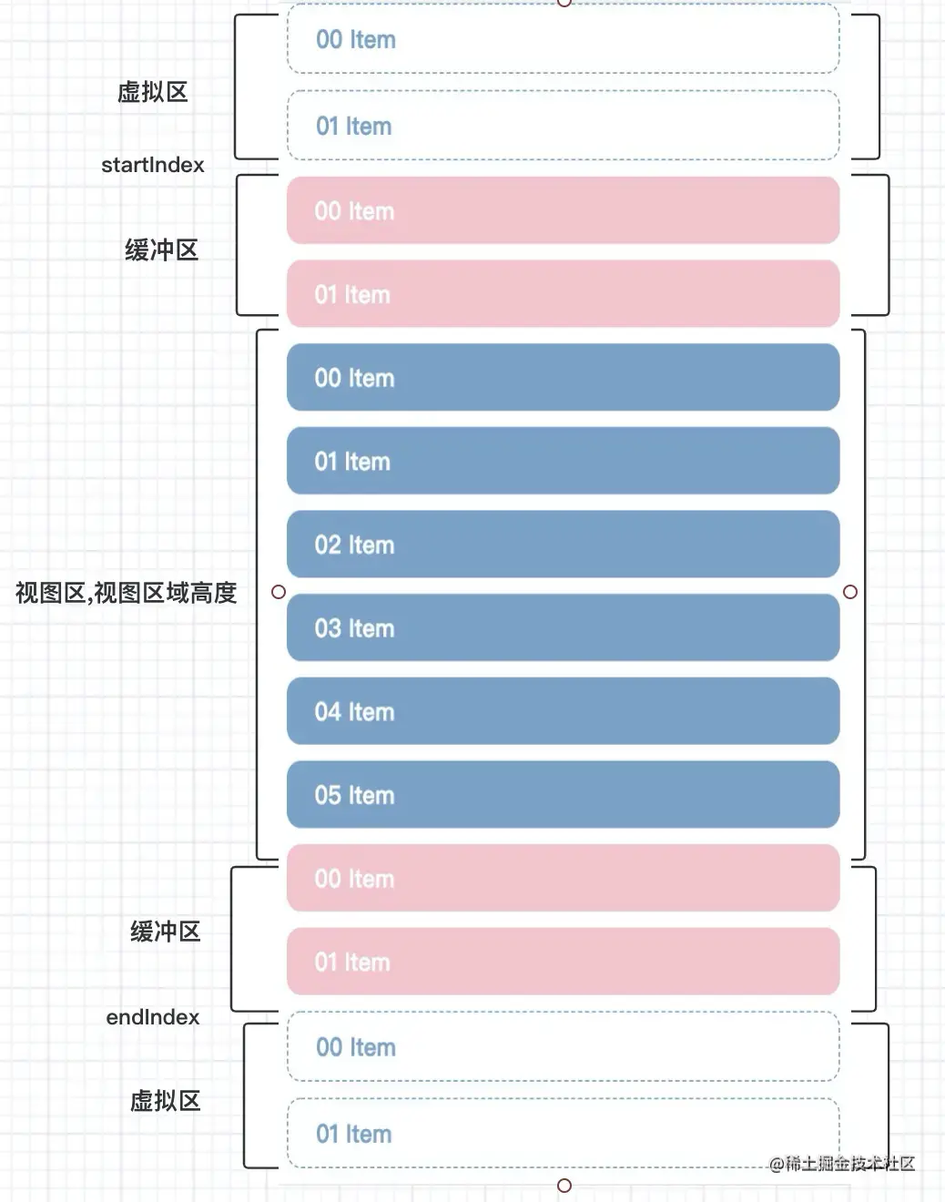 可视区域内的内容进行渲染,对非可视区域的内容不做渲染或者渲染一部分(俗称缓冲区)