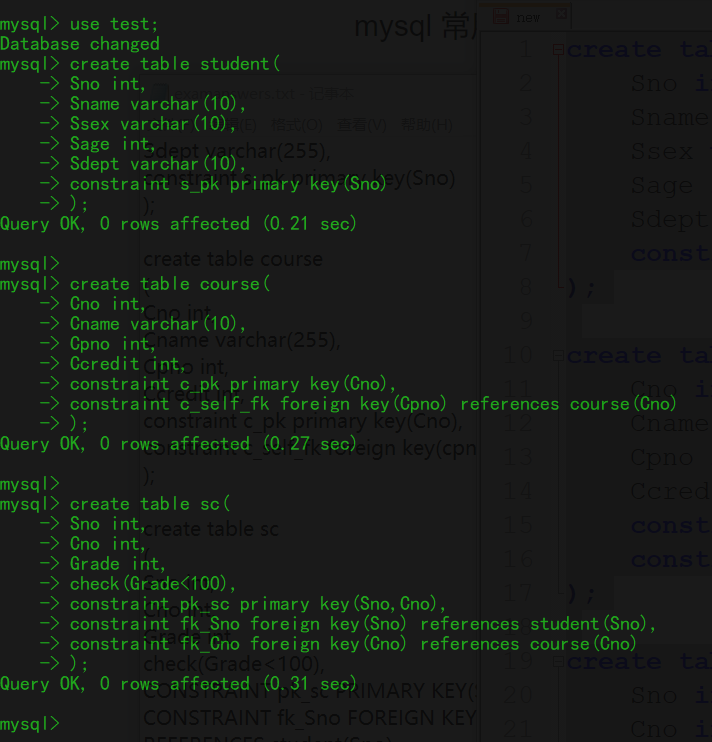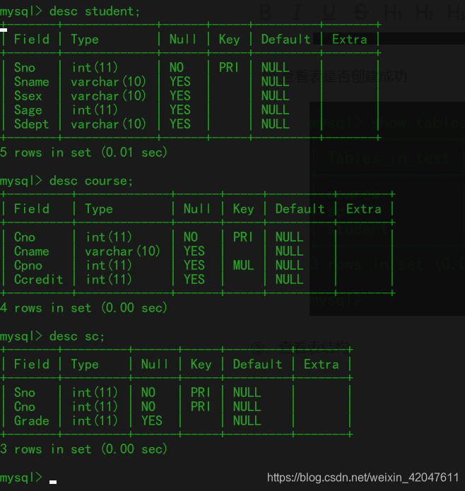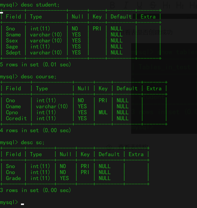 ①. eg: 创建student、sno、sc表