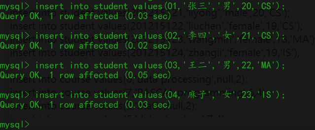 给student表插入数据,其余两个表和这个表的插入语法一致,需要注意的是course表中有个自引用,插入的先行课需要该学生先学习此门课程才能插入。