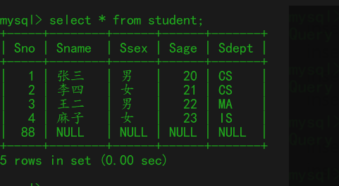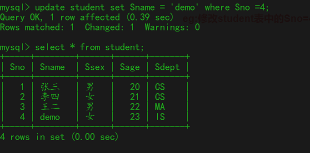eg:修改student表中的Sno=4的 Sname='demo'