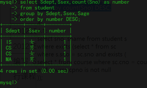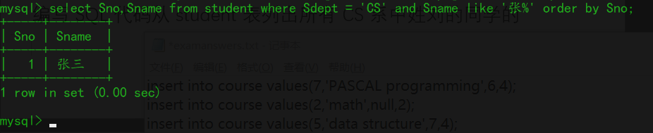 1、编写SQL代码从student表列出所有CS系中姓张的同学的学号和姓名,结果按照sno大小排序。