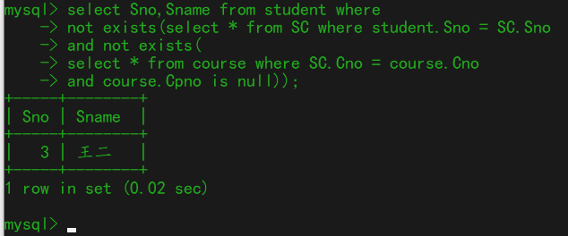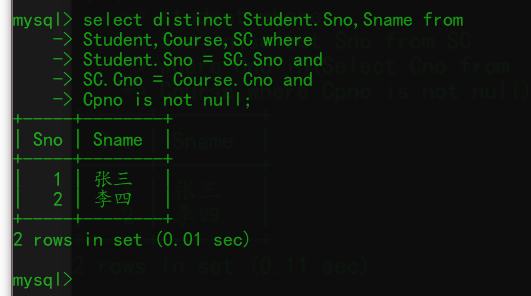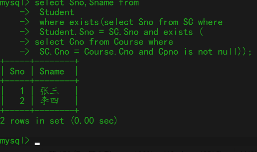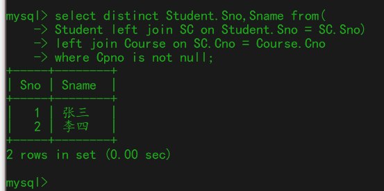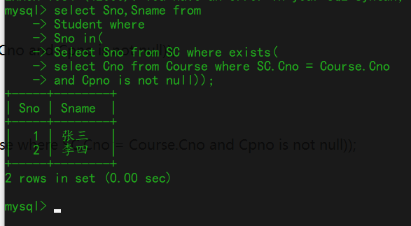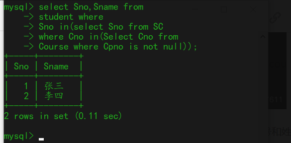 3、编写SQL代码查询选修了拥有先行课课程的学生的学号和姓名。