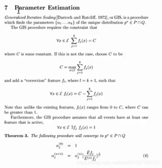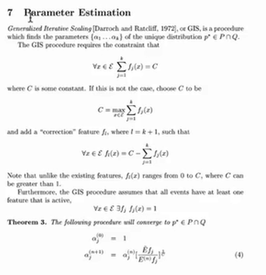 剩下的问题就是使用算法来迭代求解指数族分布中的参数αj,求出αj,整个模型的概率分布也就求出来了,使用GIS算法来求解模型里面的参数。