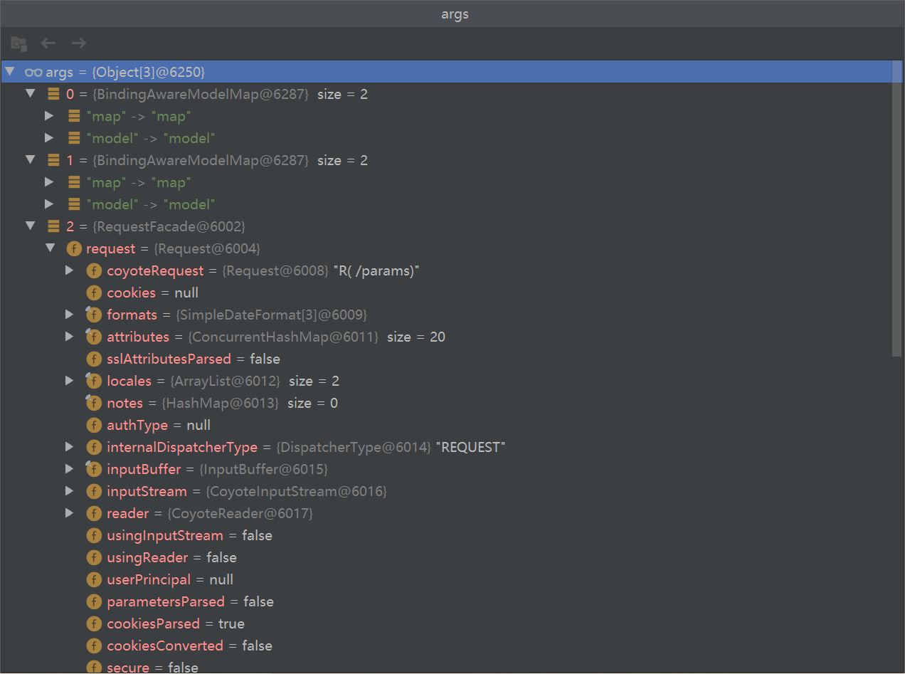 @Nullablepublic Object invokeForRequest(NativeWebRequest request, @Nullable ModelAndViewContainer mavContainer, Object... providedArgs) throws Exception {Object[] args = this.getMethodArgumentValues(request, mavContainer, providedArgs);if (logger.isTraceEnabled()) {logger.trace("Arguments: " + Arrays.toString(args));}return this.doInvoke(args);}